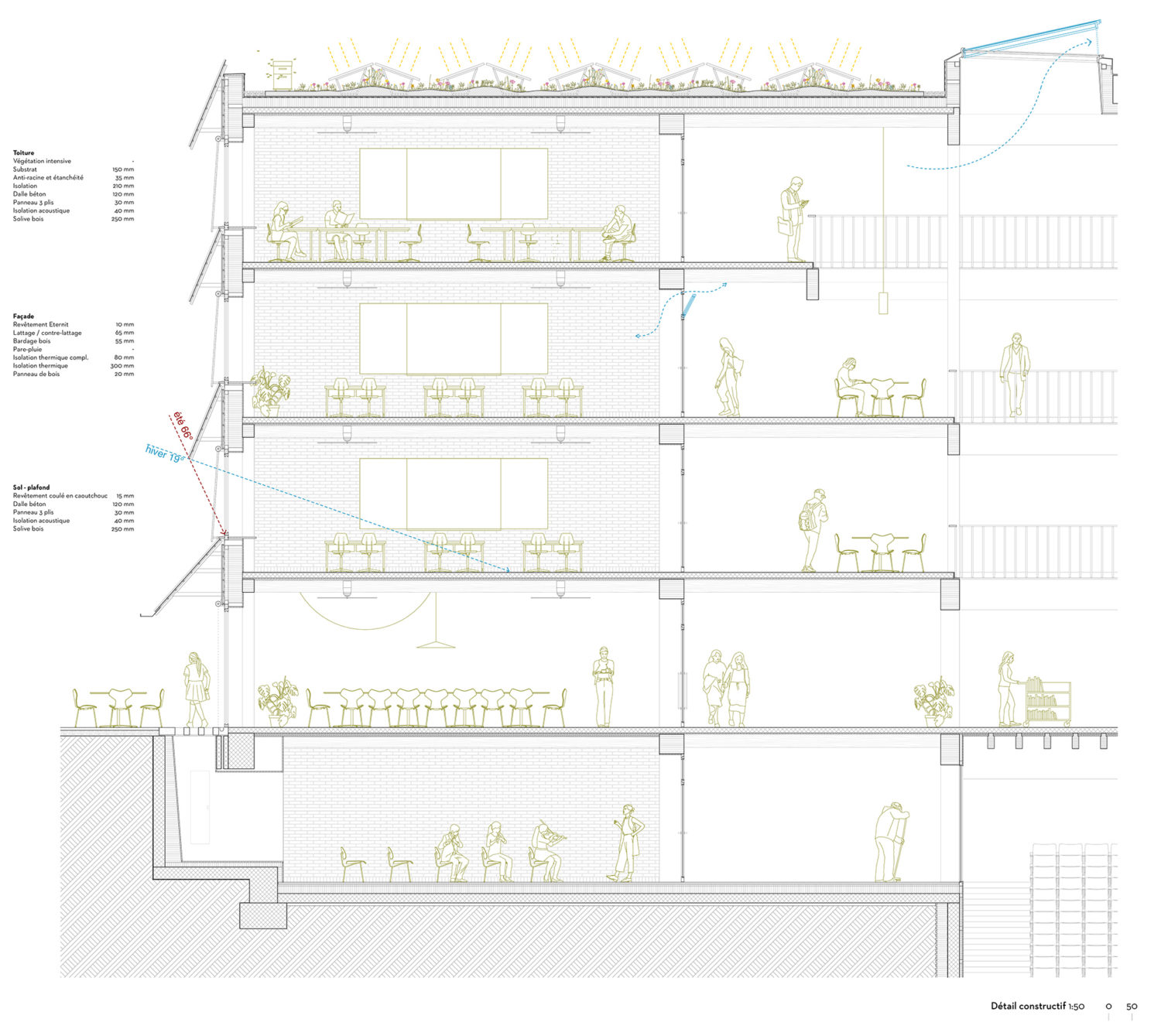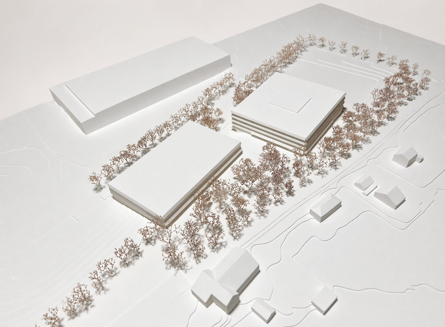 Deux volumes compacts s’inscrivent dans la pente ; leur léger décalage en plan libère une esplanade centrale, espace ouvert qui structure le site et accueille les usages.