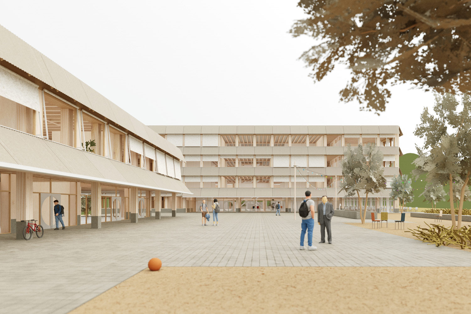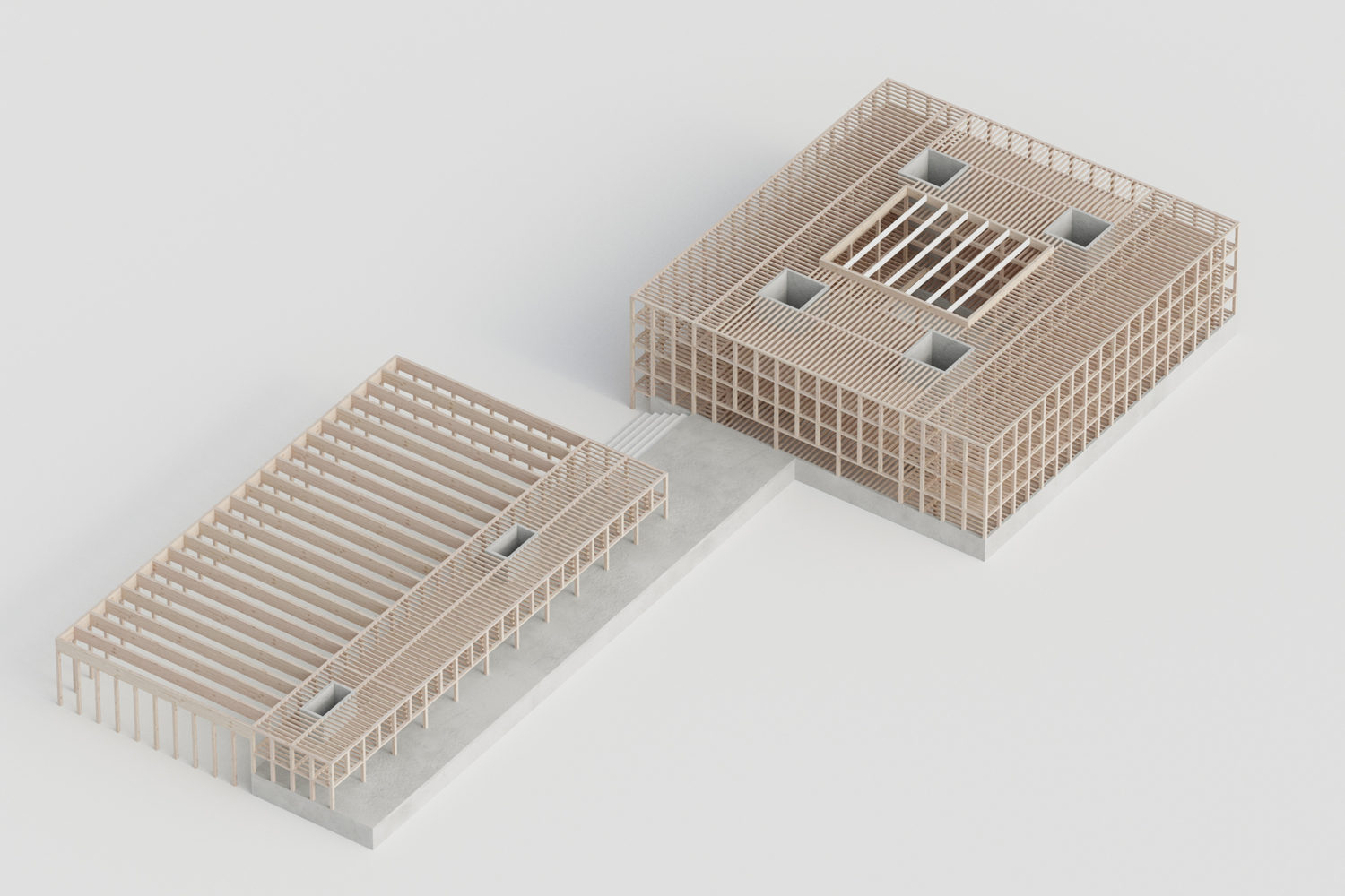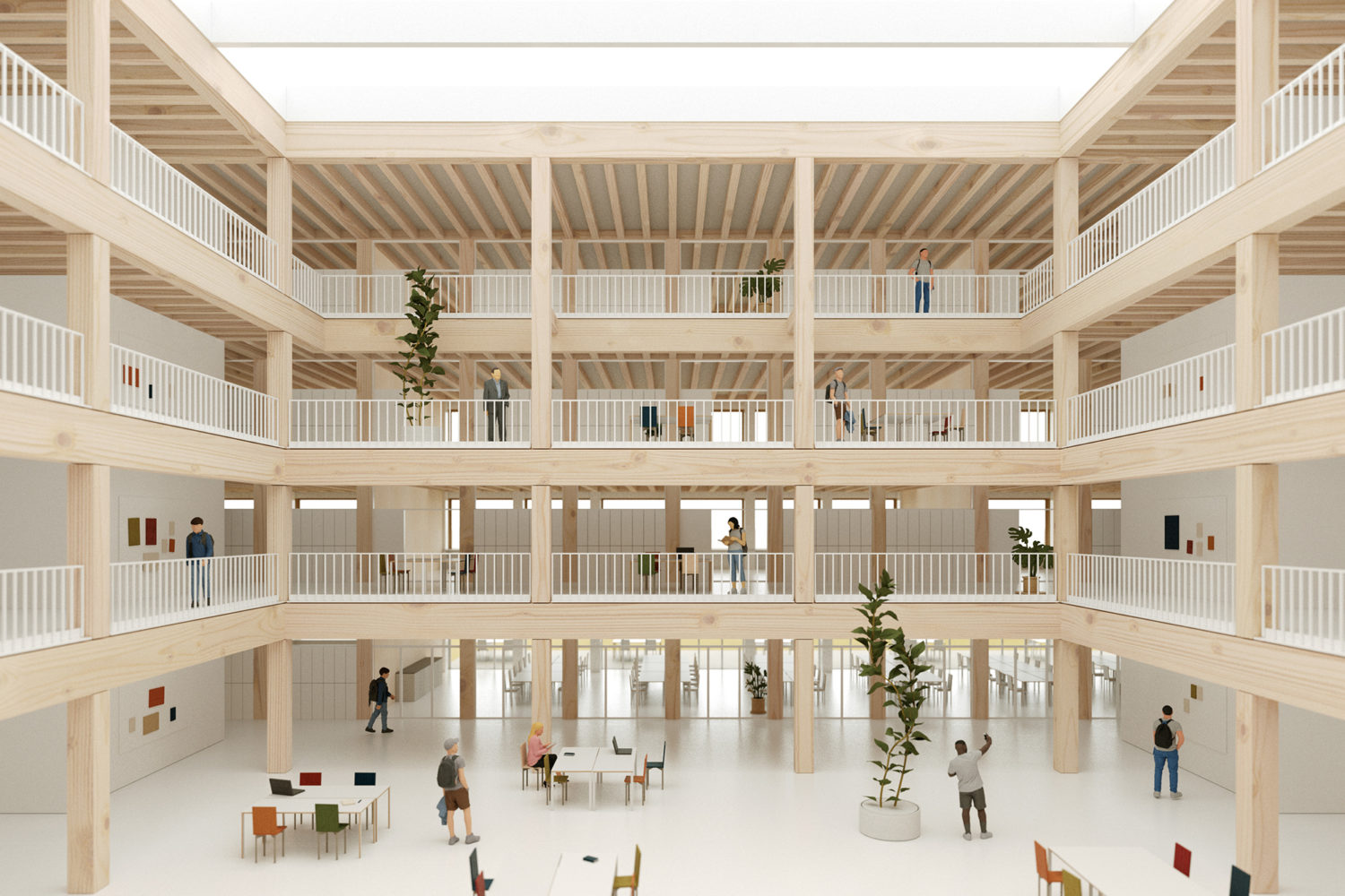 Le bâtiment scolaire accompagne le terrain, tandis que le volume sportif s’y enfonce partiellement, ajustant les gabarits et ancrant l’ensemble dans le paysage. Au cœur du bâtiment scolaire, un atrium diffuse la lumière et relie les niveaux. Il devient un vide actif, à la fois lieu de vie et souffle du projet. La structure en bois, régulière et lisible, libère les plateaux et permet l’évolution des usages dans le temps.