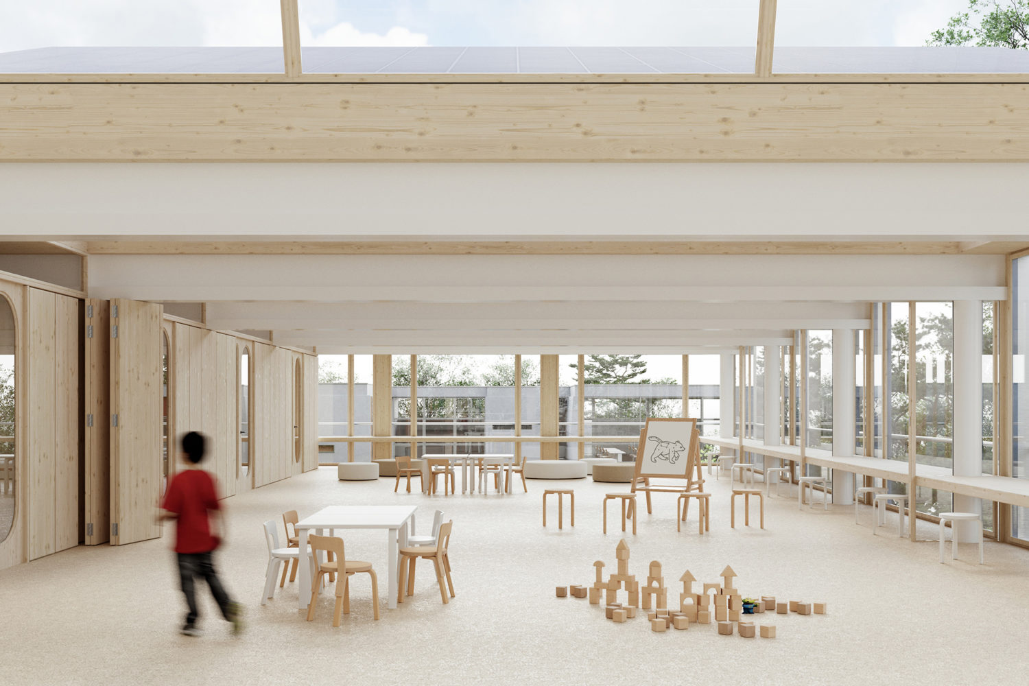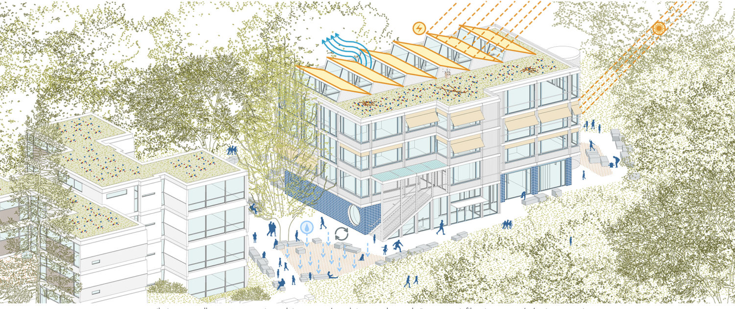 Le projet s’appuie sur l’existant et en prolonge la logique. Plutôt que d’étendre, il densifie ponctuellement, libérant le sol et préservant la continuité des préaux et du paysage arboré.